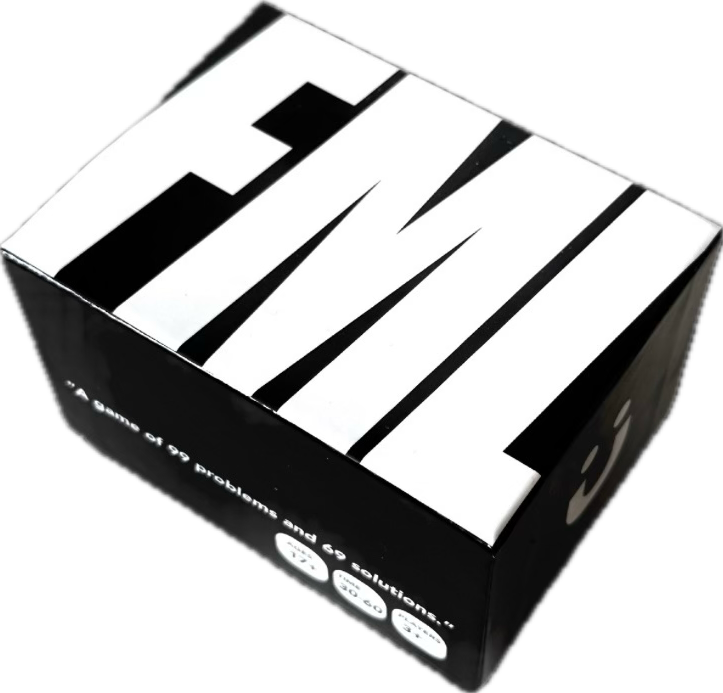 FML, a game of 99 problems and 69 solutions was inspired by the worst parts of life that we all battle. It was an attempt to put some negative energy in a positive direction. It flies in the face of blind optimism and while ultimately optimistic this game was created out of an exhaustion with the tyranny of the nice.